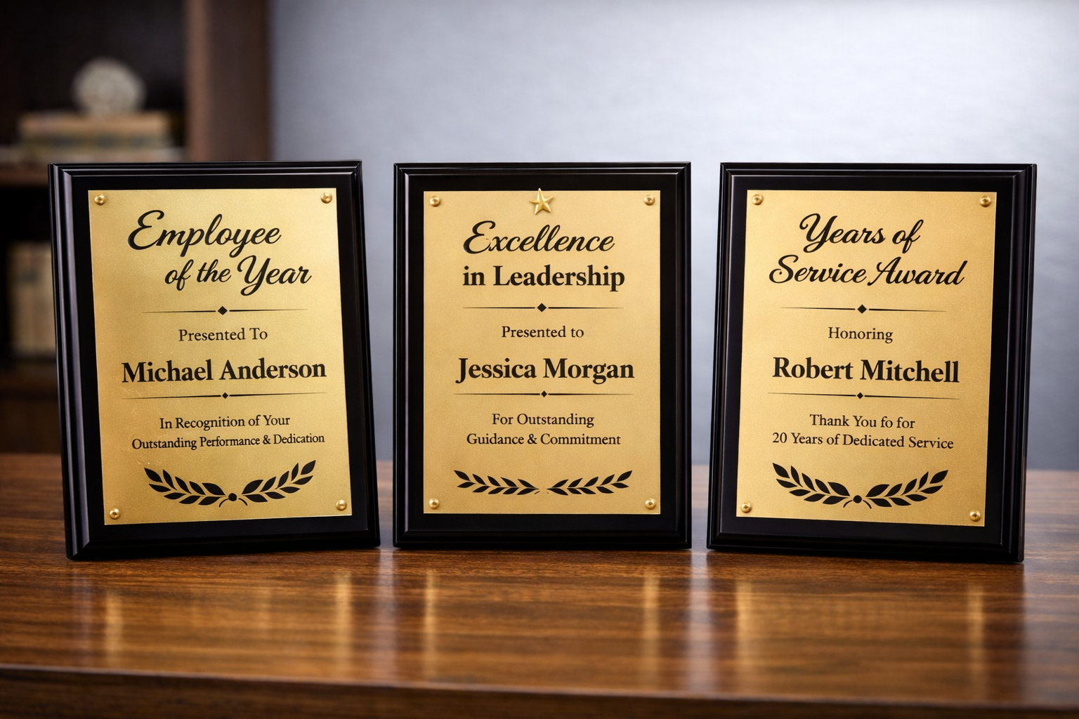 Célébrez les réussites et témoignez votre reconnaissance avec nos plaques haut de gamme. Idéales pour la reconnaissance des employés, les récompenses d'entreprise, les cérémonies scolaires, les événements sportifs et les moments marquants. Disponibles dans une variété de styles et de finitions, comme le merisier, le bois noir et le noyer classique, avec des options de gravure et de dorure personnalisables pour ajouter noms, titres, logos et messages personnels. Une façon intemporelle d'honorer l'excellence et de créer des souvenirs impérissables.